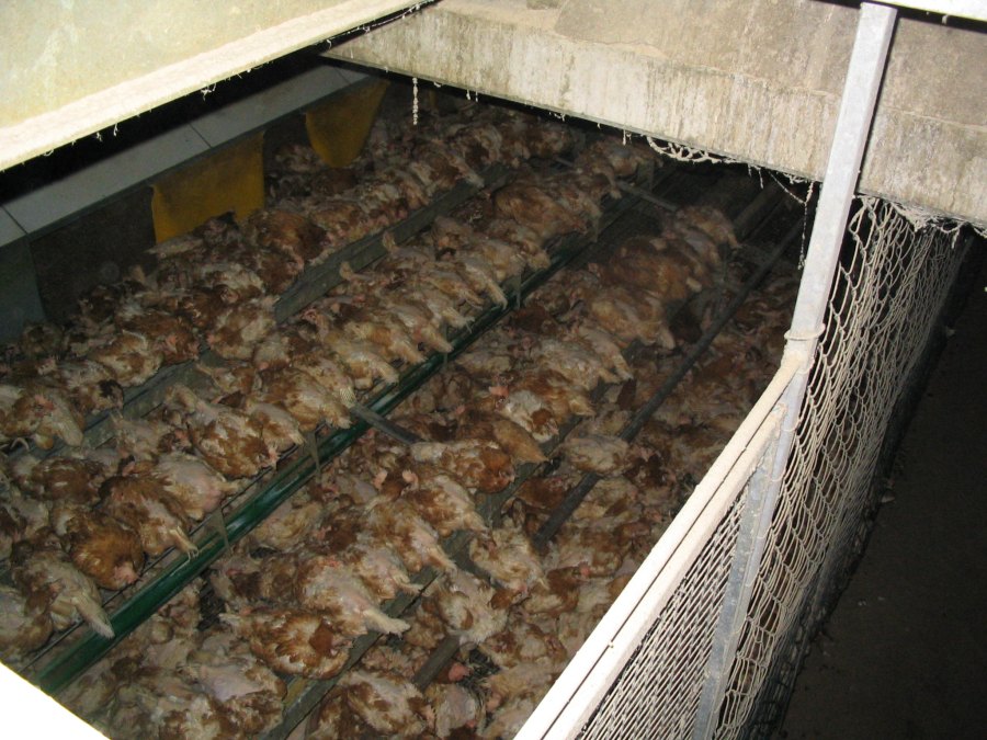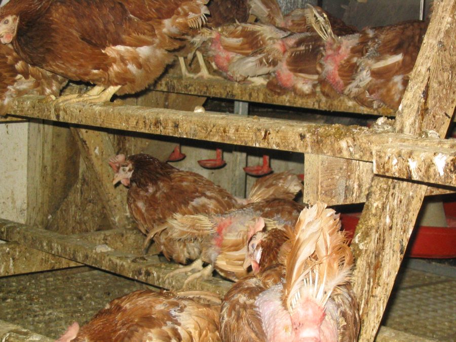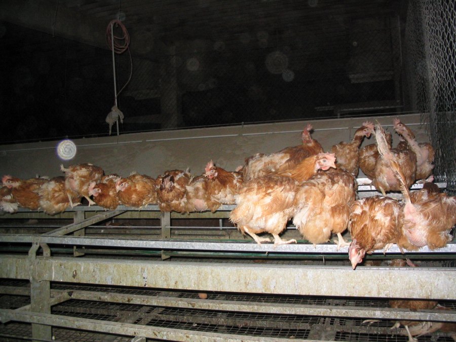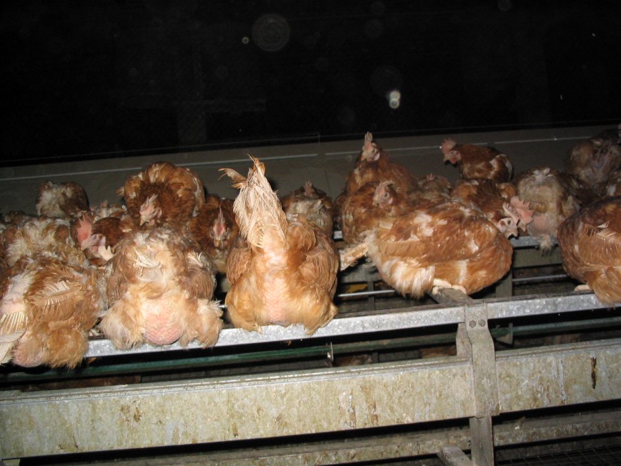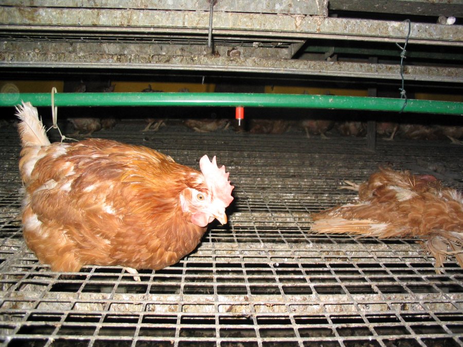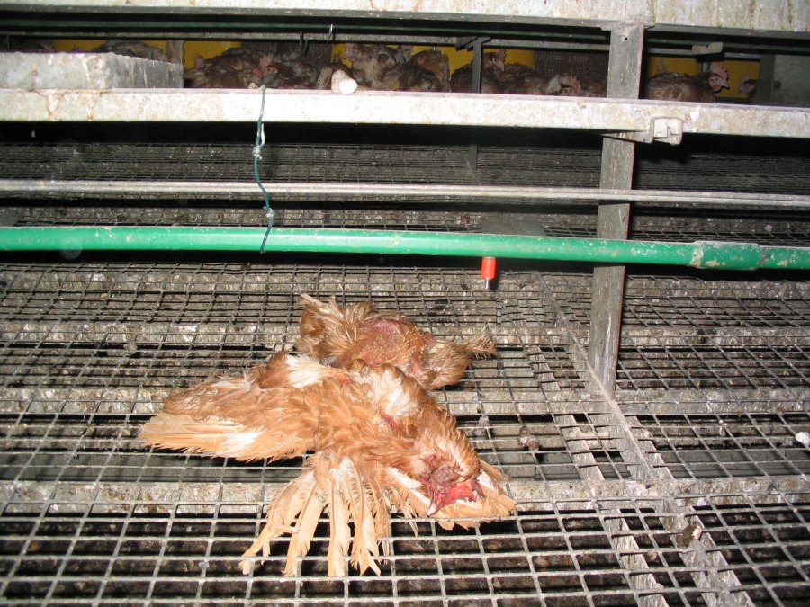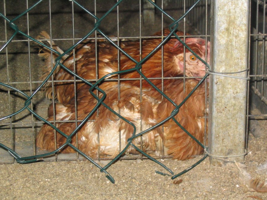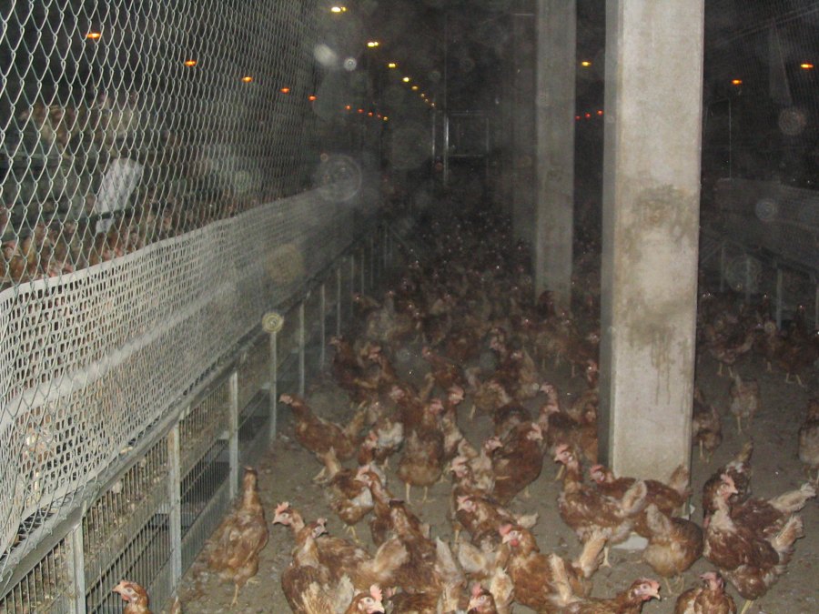 | Eine typische Bodenhaltung zur Eierproduktion: statt vieler kleiner Käfige wie in einer Legebatterie ein großer. In dieser Halle auf zwei Etagen schätzungsweise dreißigtausend Hühner. Viele von ihnen durch Technopathien, die u.a. zu Verhaltensstörungen (Federpicken) führen, großteils kahl. | Der Streifen zum "Sandbaden"/Scharren wird in der oberen Etage nur von wenigen einzelnen Tieren benutzt, die anderen sitzen überwiegend auf dem schrägen Gitterrost. | Der Blick von oben in die untere Etage zeigt, daß nahezu alle Tiere dort einen kahlen Rücken haben. | In der untere Etage wurde der Sandstreifen zum Zeitpunkt dieser Aufnahmen eher genutzt. | Wie in Legebatterien liegen auch in der Bodenhaltung überall Leichen, zum Teil stehen Hennen auf ihnen. Eine tote Henne hing mit den Füßen im Maschendraht. Am Vortag starben 21 Tiere in diesem "Stall 1" (die gesamte Anlage besteht aus zwei "Ställen"). | Während ein normales Huhn etwa ein Dutzend Eier im Jahr legt, um sich fortzupflanzen, sind natürlich auch die Hühner in Bodenhaltungen Qualzüchtungen, die fast täglich ein Ei legen. Ergebnis ist (da die Eischale aus Kalk besteht) Kalziummangel, so entstehen in einigen Fällen Fließeier (ohne Kalkschale). | Eier: manche gehen gleich, andere beim Verpacken zu Bruch. Bei vielen lassen die Schalen Krankheiten der Hühner erkennen; einige sind blutbeschmiert. In "Stall 1", so ergaben unsere Recherchen, wurden am Vortag - immer jeweils etwa gleich viele in der oberen und unteren Etage - 28381 Eier "produziert", 28106 landeten im "Farmpacker", 25 waren "Aufschlag", 250 "Schmutzeier". Außerdem gab es 134 "verlegte Eier". Der "Futterverbrauch" betrug knapp dreieinhalb Tonnen. Daten für "Stall 2" liegen uns nicht vor. | Die Toten enden in den Mülltonnen. | Auch wenn weniger Tiere an einem Ort zugleich ausgebeutet werden - am Prinzip ändert das nichts. Hier etwa sind die "Ställe" unterteilt, so daß nur einige Dutzend Hennen zusammen sind. In dieser Abteilung wurden offenbar erst kürzlich junge Hennen untergebracht (die alten zu "Suppenhühnern" etc. verarbeitet). Durch die aufgestellten Sitzstangen ("A-Reuter") wird diese Form der gefangenhaltung auch oft als Volierenhaltung bezeichnet. | Und so sehen sie - trotzt der vergleichsweise geringen Gruppengröße - nach einigen Monaten (hier in der Nachbarabteilung) aus: überwiegend kahl, krank, sterbend. | Direkt daneben eine andere Form der Bodenhaltung, ohne Sitzstangen, lediglich auf einem herumstehenden Gitter und den "Legenestern" können die Hennen "aufbaumen". Auch hier liegen Leichen. | Die, die unter diesen Bedingungen sterben, enden auch hier in den Mülltonnen. | Eine modifizierte Bodenhaltung ist die Volierenhaltung, näheres siehe dort. | Weitere Bilder von Hühnern aus Bodenhaltung zur Eierproduktion (Vermehrungsbetrieb, Leichen, Befreiungsaktionen) | Weitere Bilder von Gänsen, Enten und Truthühnern aus Bodenhaltung zur "Fleisch"produktion | |||||||||||||||||||||||||||||||||||||||||||||||||||||||||||||||||||||||||||||||||||||||||||||||||||||||
