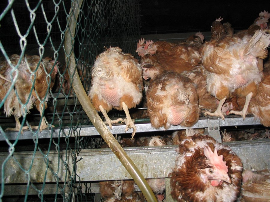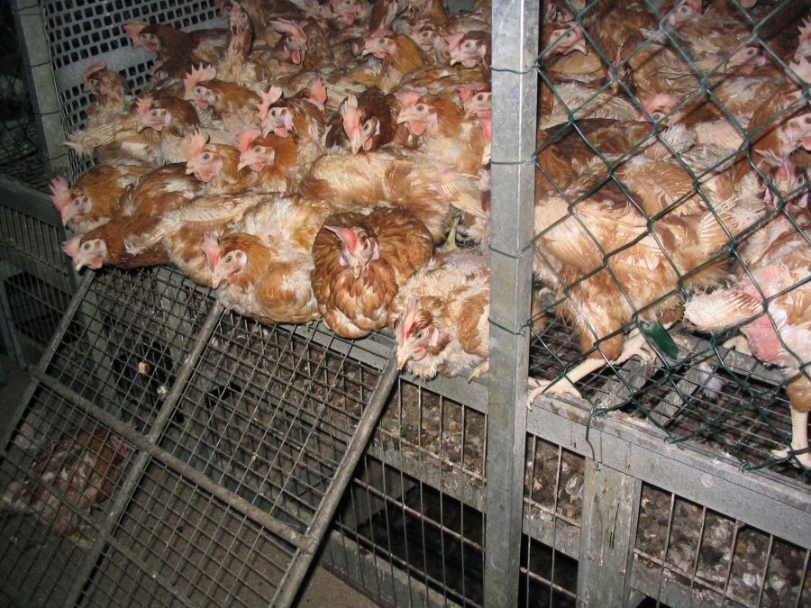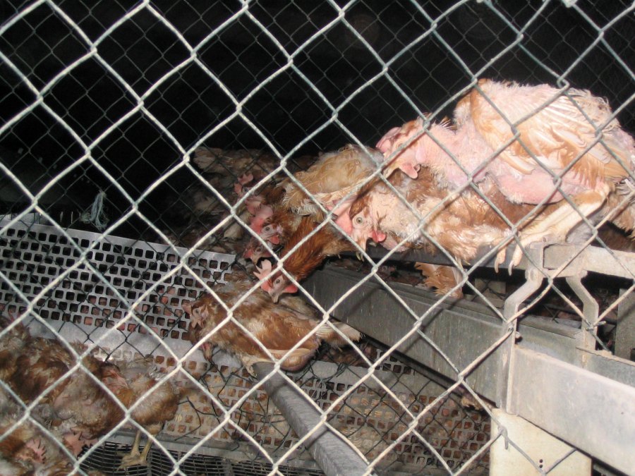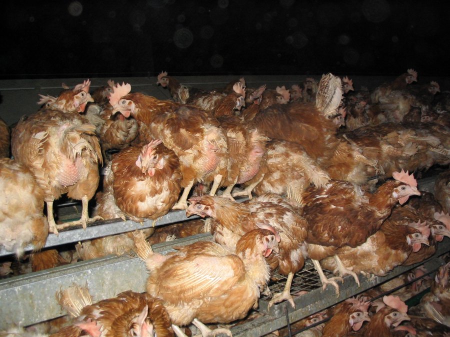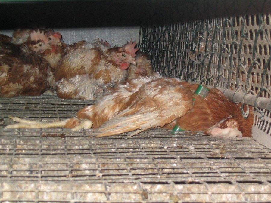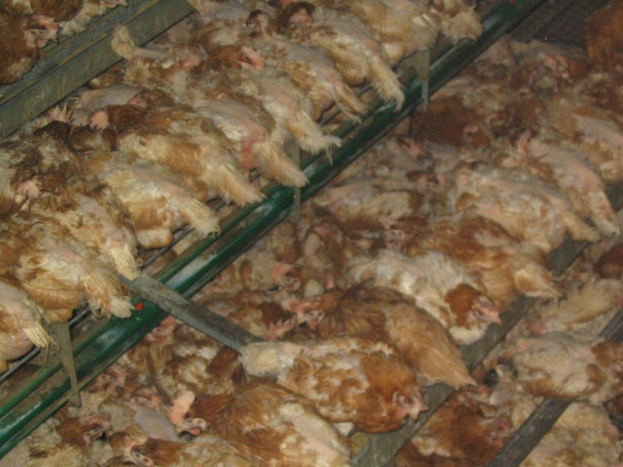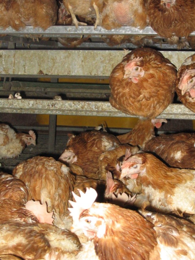 | Eine typische Bodenhaltung zur Eierproduktion: statt vieler kleiner Käfige wie in einer Legebatterie ein großer. In dieser Halle auf zwei Etagen schätzungsweise dreißigtausend Hühner. Viele von ihnen durch Technopathien, die u.a. zu Verhaltensstörungen (Federpicken) führen, großteils kahl. | Der Streifen zum "Sandbaden"/Scharren wird in der oberen Etage nur von wenigen einzelnen Tieren benutzt, die anderen sitzen überwiegend auf dem schrägen Gitterrost. | Der Blick von oben in die untere Etage zeigt, daß nahezu alle Tiere dort einen kahlen Rücken haben. | In der untere Etage wurde der Sandstreifen zum Zeitpunkt dieser Aufnahmen eher genutzt. | Wie in Legebatterien liegen auch in der Bodenhaltung überall Leichen, zum Teil stehen Hennen auf ihnen. Eine tote Henne hing mit den Füßen im Maschendraht. Am Vortag starben 21 Tiere in diesem "Stall 1" (die gesamte Anlage besteht aus zwei "Ställen"). | Während ein normales Huhn etwa ein Dutzend Eier im Jahr legt, um sich fortzupflanzen, sind natürlich auch die Hühner in Bodenhaltungen Qualzüchtungen, die fast täglich ein Ei legen. Ergebnis ist (da die Eischale aus Kalk besteht) Kalziummangel, so entstehen in einigen Fällen Fließeier (ohne Kalkschale). | Eier: manche gehen gleich, andere beim Verpacken zu Bruch. Bei vielen lassen die Schalen Krankheiten der Hühner erkennen; einige sind blutbeschmiert. In "Stall 1", so ergaben unsere Recherchen, wurden am Vortag - immer jeweils etwa gleich viele in der oberen und unteren Etage - 28381 Eier "produziert", 28106 landeten im "Farmpacker", 25 waren "Aufschlag", 250 "Schmutzeier". Außerdem gab es 134 "verlegte Eier". Der "Futterverbrauch" betrug knapp dreieinhalb Tonnen. Daten für "Stall 2" liegen uns nicht vor. | Die Toten enden in den Mülltonnen. | Auch wenn weniger Tiere an einem Ort zugleich ausgebeutet werden - am Prinzip ändert das nichts. Hier etwa sind die "Ställe" unterteilt, so daß nur einige Dutzend Hennen zusammen sind. In dieser Abteilung wurden offenbar erst kürzlich junge Hennen untergebracht (die alten zu "Suppenhühnern" etc. verarbeitet). Durch die aufgestellten Sitzstangen ("A-Reuter") wird diese Form der gefangenhaltung auch oft als Volierenhaltung bezeichnet. | Und so sehen sie - trotzt der vergleichsweise geringen Gruppengröße - nach einigen Monaten (hier in der Nachbarabteilung) aus: überwiegend kahl, krank, sterbend. | Direkt daneben eine andere Form der Bodenhaltung, ohne Sitzstangen, lediglich auf einem herumstehenden Gitter und den "Legenestern" können die Hennen "aufbaumen". Auch hier liegen Leichen. | Die, die unter diesen Bedingungen sterben, enden auch hier in den Mülltonnen. | Eine modifizierte Bodenhaltung ist die Volierenhaltung, näheres siehe dort. | Weitere Bilder von Hühnern aus Bodenhaltung zur Eierproduktion (Vermehrungsbetrieb, Leichen, Befreiungsaktionen) | Weitere Bilder von Gänsen, Enten und Truthühnern aus Bodenhaltung zur "Fleisch"produktion | |||||||||||||||||||||||||||||||||||||||||||||||||||||||||||||||||||||||||||||||||||||||||||||||||||||||