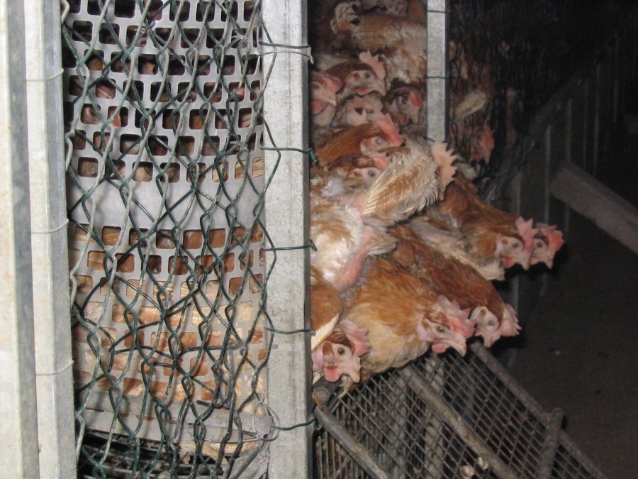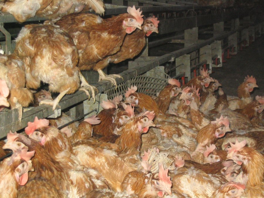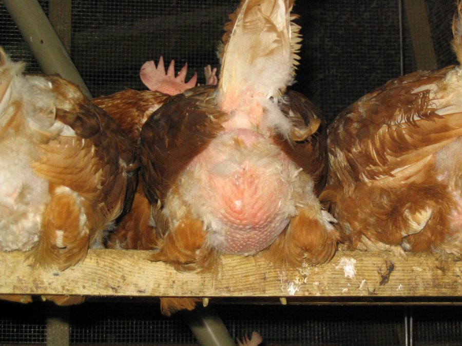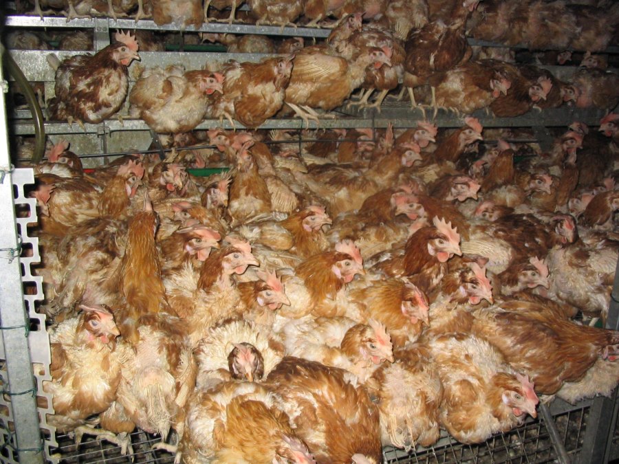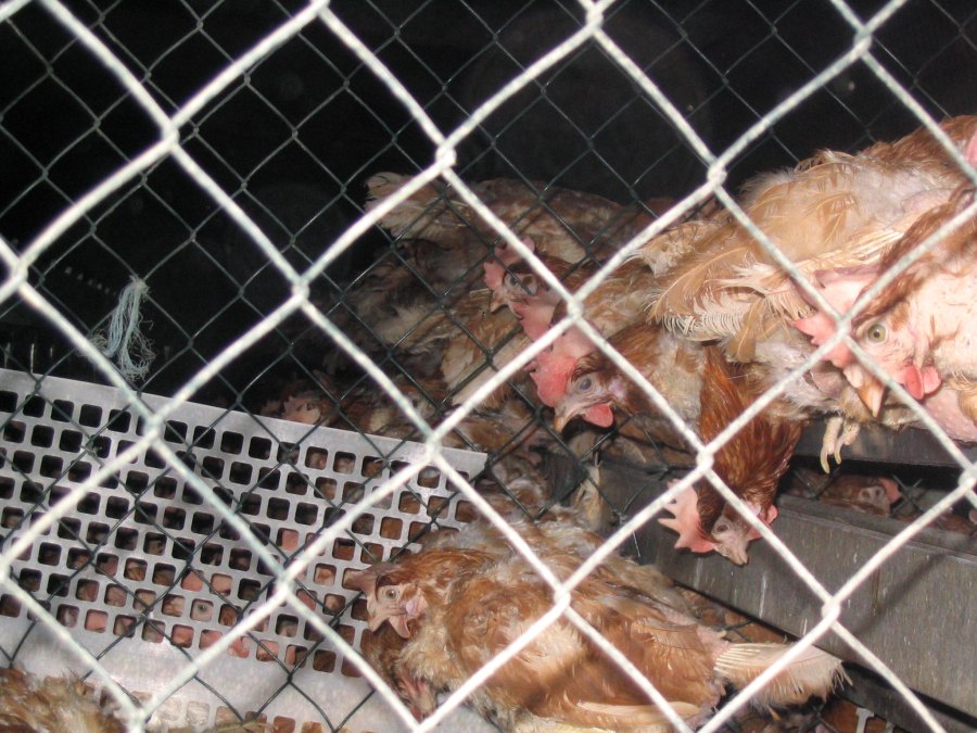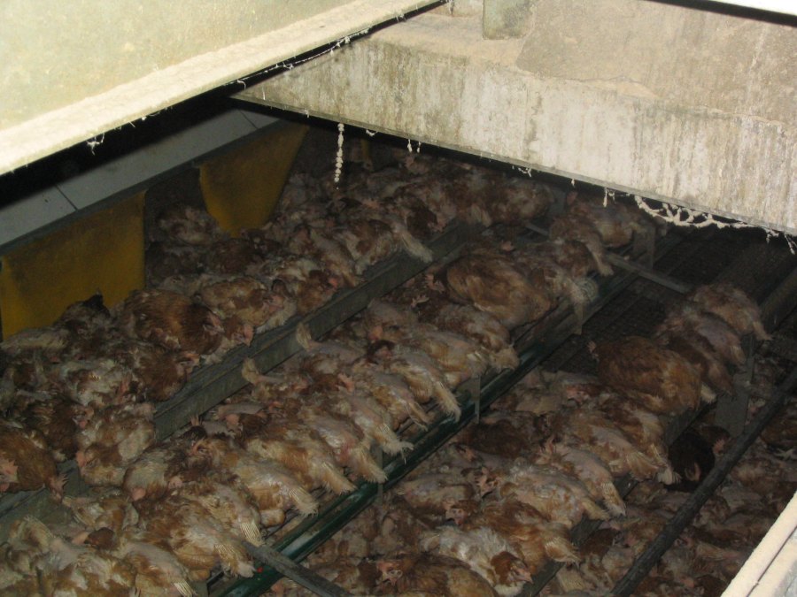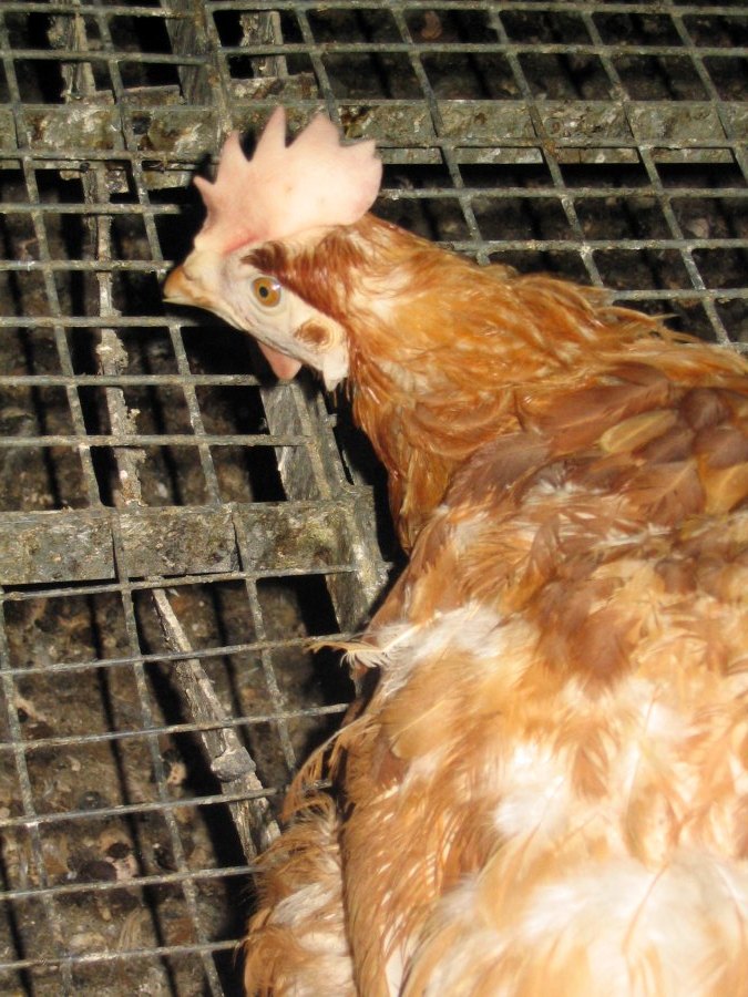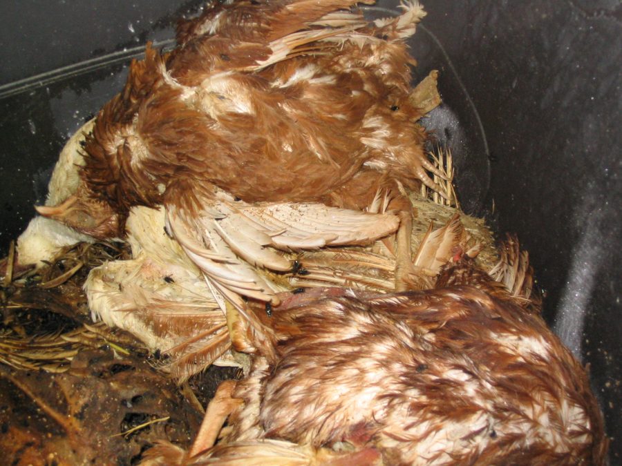 | Eine typische Bodenhaltung zur Eierproduktion: statt vieler kleiner Käfige wie in einer Legebatterie ein großer. In dieser Halle auf zwei Etagen schätzungsweise dreißigtausend Hühner. Viele von ihnen durch Technopathien, die u.a. zu Verhaltensstörungen (Federpicken) führen, großteils kahl. | Der Streifen zum "Sandbaden"/Scharren wird in der oberen Etage nur von wenigen einzelnen Tieren benutzt, die anderen sitzen überwiegend auf dem schrägen Gitterrost. | Der Blick von oben in die untere Etage zeigt, daß nahezu alle Tiere dort einen kahlen Rücken haben. | In der untere Etage wurde der Sandstreifen zum Zeitpunkt dieser Aufnahmen eher genutzt. | Wie in Legebatterien liegen auch in der Bodenhaltung überall Leichen, zum Teil stehen Hennen auf ihnen. Eine tote Henne hing mit den Füßen im Maschendraht. Am Vortag starben 21 Tiere in diesem "Stall 1" (die gesamte Anlage besteht aus zwei "Ställen"). | Während ein normales Huhn etwa ein Dutzend Eier im Jahr legt, um sich fortzupflanzen, sind natürlich auch die Hühner in Bodenhaltungen Qualzüchtungen, die fast täglich ein Ei legen. Ergebnis ist (da die Eischale aus Kalk besteht) Kalziummangel, so entstehen in einigen Fällen Fließeier (ohne Kalkschale). | Eier: manche gehen gleich, andere beim Verpacken zu Bruch. Bei vielen lassen die Schalen Krankheiten der Hühner erkennen; einige sind blutbeschmiert. In "Stall 1", so ergaben unsere Recherchen, wurden am Vortag - immer jeweils etwa gleich viele in der oberen und unteren Etage - 28381 Eier "produziert", 28106 landeten im "Farmpacker", 25 waren "Aufschlag", 250 "Schmutzeier". Außerdem gab es 134 "verlegte Eier". Der "Futterverbrauch" betrug knapp dreieinhalb Tonnen. Daten für "Stall 2" liegen uns nicht vor. | Die Toten enden in den Mülltonnen. | Auch wenn weniger Tiere an einem Ort zugleich ausgebeutet werden - am Prinzip ändert das nichts. Hier etwa sind die "Ställe" unterteilt, so daß nur einige Dutzend Hennen zusammen sind. In dieser Abteilung wurden offenbar erst kürzlich junge Hennen untergebracht (die alten zu "Suppenhühnern" etc. verarbeitet). Durch die aufgestellten Sitzstangen ("A-Reuter") wird diese Form der gefangenhaltung auch oft als Volierenhaltung bezeichnet. | Und so sehen sie - trotzt der vergleichsweise geringen Gruppengröße - nach einigen Monaten (hier in der Nachbarabteilung) aus: überwiegend kahl, krank, sterbend. | Direkt daneben eine andere Form der Bodenhaltung, ohne Sitzstangen, lediglich auf einem herumstehenden Gitter und den "Legenestern" können die Hennen "aufbaumen". Auch hier liegen Leichen. | Die, die unter diesen Bedingungen sterben, enden auch hier in den Mülltonnen. | Eine modifizierte Bodenhaltung ist die Volierenhaltung, näheres siehe dort. | Weitere Bilder von Hühnern aus Bodenhaltung zur Eierproduktion (Vermehrungsbetrieb, Leichen, Befreiungsaktionen) | Weitere Bilder von Gänsen, Enten und Truthühnern aus Bodenhaltung zur "Fleisch"produktion | |||||||||||||||||||||||||||||||||||||||||||||||||||||||||||||||||||||||||||||||||||||||||||||||||||||||