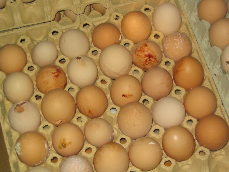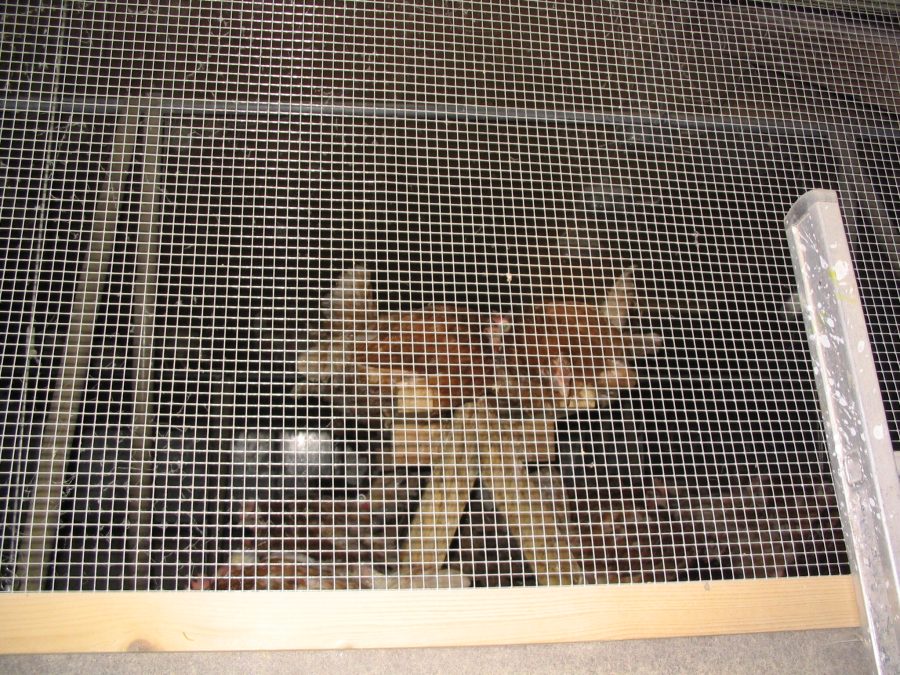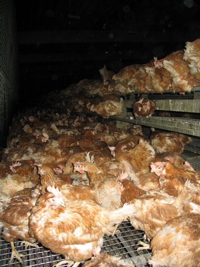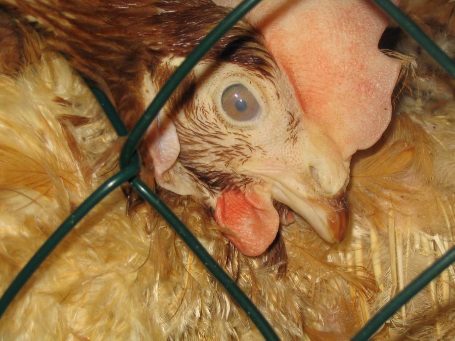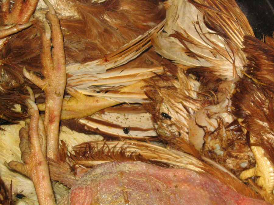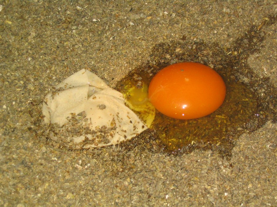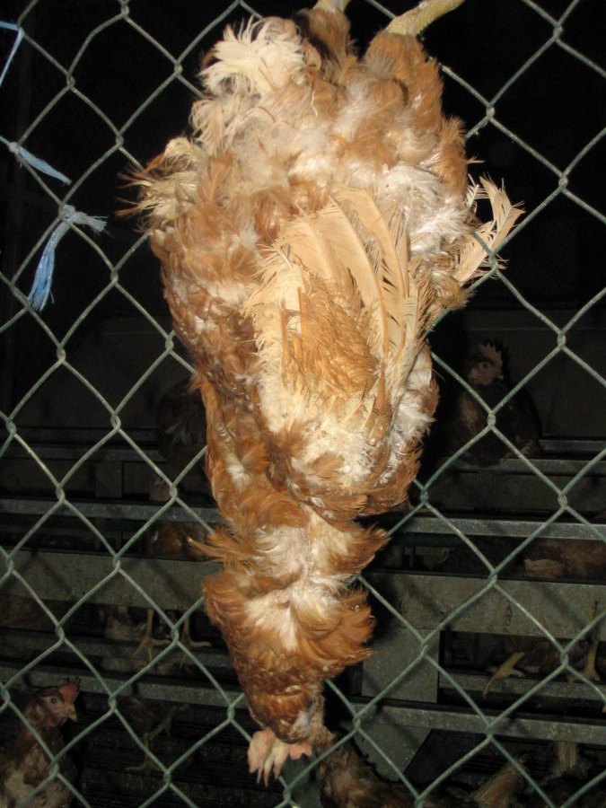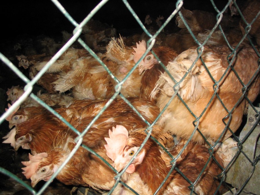 | Eine typische Bodenhaltung zur Eierproduktion: statt vieler kleiner Käfige wie in einer Legebatterie ein großer. In dieser Halle auf zwei Etagen schätzungsweise dreißigtausend Hühner. Viele von ihnen durch Technopathien, die u.a. zu Verhaltensstörungen (Federpicken) führen, großteils kahl. | Der Streifen zum "Sandbaden"/Scharren wird in der oberen Etage nur von wenigen einzelnen Tieren benutzt, die anderen sitzen überwiegend auf dem schrägen Gitterrost. | Der Blick von oben in die untere Etage zeigt, daß nahezu alle Tiere dort einen kahlen Rücken haben. | In der untere Etage wurde der Sandstreifen zum Zeitpunkt dieser Aufnahmen eher genutzt. | Wie in Legebatterien liegen auch in der Bodenhaltung überall Leichen, zum Teil stehen Hennen auf ihnen. Eine tote Henne hing mit den Füßen im Maschendraht. Am Vortag starben 21 Tiere in diesem "Stall 1" (die gesamte Anlage besteht aus zwei "Ställen"). | Während ein normales Huhn etwa ein Dutzend Eier im Jahr legt, um sich fortzupflanzen, sind natürlich auch die Hühner in Bodenhaltungen Qualzüchtungen, die fast täglich ein Ei legen. Ergebnis ist (da die Eischale aus Kalk besteht) Kalziummangel, so entstehen in einigen Fällen Fließeier (ohne Kalkschale). | Eier: manche gehen gleich, andere beim Verpacken zu Bruch. Bei vielen lassen die Schalen Krankheiten der Hühner erkennen; einige sind blutbeschmiert. In "Stall 1", so ergaben unsere Recherchen, wurden am Vortag - immer jeweils etwa gleich viele in der oberen und unteren Etage - 28381 Eier "produziert", 28106 landeten im "Farmpacker", 25 waren "Aufschlag", 250 "Schmutzeier". Außerdem gab es 134 "verlegte Eier". Der "Futterverbrauch" betrug knapp dreieinhalb Tonnen. Daten für "Stall 2" liegen uns nicht vor. | Die Toten enden in den Mülltonnen. | Auch wenn weniger Tiere an einem Ort zugleich ausgebeutet werden - am Prinzip ändert das nichts. Hier etwa sind die "Ställe" unterteilt, so daß nur einige Dutzend Hennen zusammen sind. In dieser Abteilung wurden offenbar erst kürzlich junge Hennen untergebracht (die alten zu "Suppenhühnern" etc. verarbeitet). Durch die aufgestellten Sitzstangen ("A-Reuter") wird diese Form der gefangenhaltung auch oft als Volierenhaltung bezeichnet. | Und so sehen sie - trotzt der vergleichsweise geringen Gruppengröße - nach einigen Monaten (hier in der Nachbarabteilung) aus: überwiegend kahl, krank, sterbend. | Direkt daneben eine andere Form der Bodenhaltung, ohne Sitzstangen, lediglich auf einem herumstehenden Gitter und den "Legenestern" können die Hennen "aufbaumen". Auch hier liegen Leichen. | Die, die unter diesen Bedingungen sterben, enden auch hier in den Mülltonnen. | Eine modifizierte Bodenhaltung ist die Volierenhaltung, näheres siehe dort. | Weitere Bilder von Hühnern aus Bodenhaltung zur Eierproduktion (Vermehrungsbetrieb, Leichen, Befreiungsaktionen) | Weitere Bilder von Gänsen, Enten und Truthühnern aus Bodenhaltung zur "Fleisch"produktion | |||||||||||||||||||||||||||||||||||||||||||||||||||||||||||||||||||||||||||||||||||||||||||||||||||||||