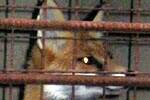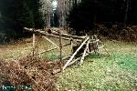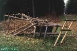 | Salzlecke (Hintergrund: Maiskiste und Hochsitz) | Ein Wecker in einem Kasten, der mit einer maisgefüllten Kiste verbunden ist | Die Maiskiste, im Hintergund der Hochsitz | Äpfel neben der Maiskiste | Blutspuren im Schnee | Leichengrube mit Köpfen, Füßen, Organen (Mitte: Ausschnitt) | Der Hochsitz aus der Nähe | Eimer mit gefrorenen Leichenteilen am Fuß des Hochsitzes | Gesamtansicht von der Kanzel (Maiskiste, Leichengrube, vorne weitere Blutspuren) | Maiskiste, an gegenüber Winter etwas verschobener Stelle, daneben Kartoffeln, vorne Äpfel; im Hintergrund die Leiter des (inzwischen umgesägten) Hochsitzes und die aufgestapelten Reste der Kanzel und der Stützen; rechts Nahaufnahme der Maiskiste und Kartoffeln | Vorne Organe und Blut, hinten wieder die Hochsitzreste | Nahaufnahme der Organe | Die selbe Leichengrube, wieder mit Köpfen, Füßen, Organen (rechts: Ausschnitt) | Bei autonomen Tierrechtsaktionen unbrauchbar gemachte Hochsitze. Sie werden, entgegen der verbreiteten Jägerpropaganda, nicht menschengefährdend an-, sondern umgesägt oder, wie rechts, zersägt (hier: Leiter und Kanzel). | Jäger bei einer Jagdstörung (siehe auch Pressemitteilung). Die mäßige Bildqualität ist auf die schlechten Lichtverhältnisse und die Gesamtsituation zurückzuführen. | Eine Schliefanlage ahmt künstlich einen "Fuchsbau" nach und dient der "Ausbildung" von "Jagdhunden". An einer Seite wird der gefangengehaltene Fuchs in das Röhrensystem gesperrt. Ein Schieber trennt Fuchs und Hund, der ihn dort aufstöbert und ihn laut bellend bedrängt . | In diesem Zwinger neben der Schliefanlage werden zu diesem Zweck zwei Füchse gefangengehalten. | Fasane in der "Kleinmarkthalle", weitere Bilder von dort in der Rubrik "Leichen". | Im Kleingedruckten: "Weidwerk verpflichtet". | |||||||||||||||||||||||