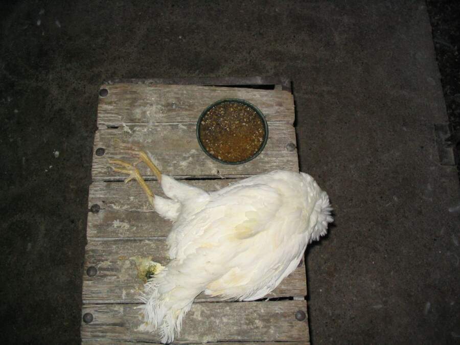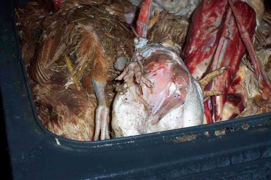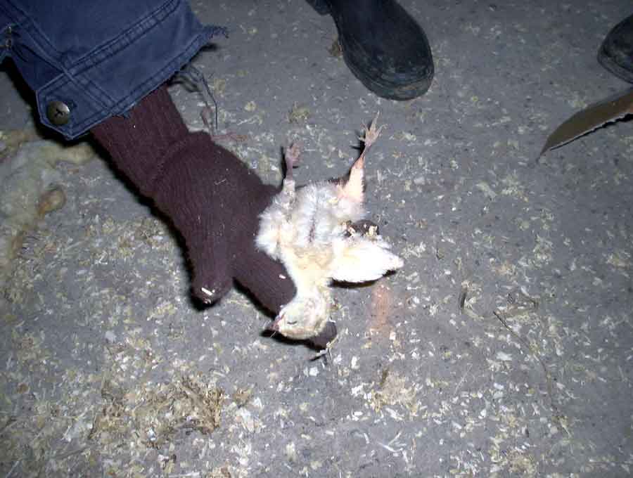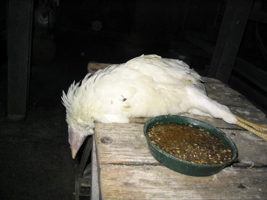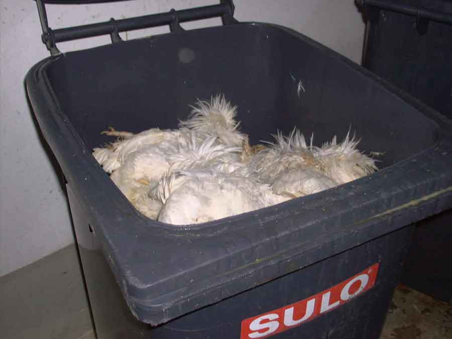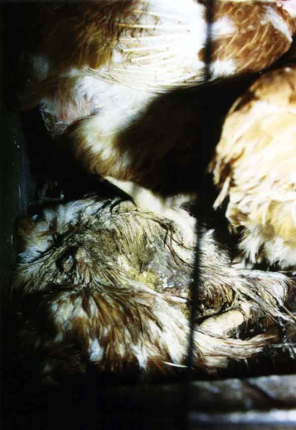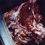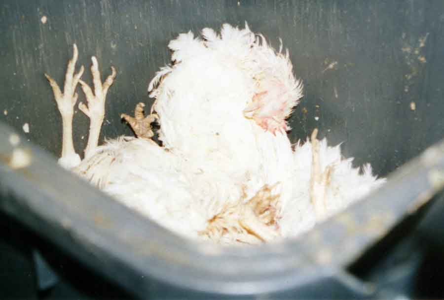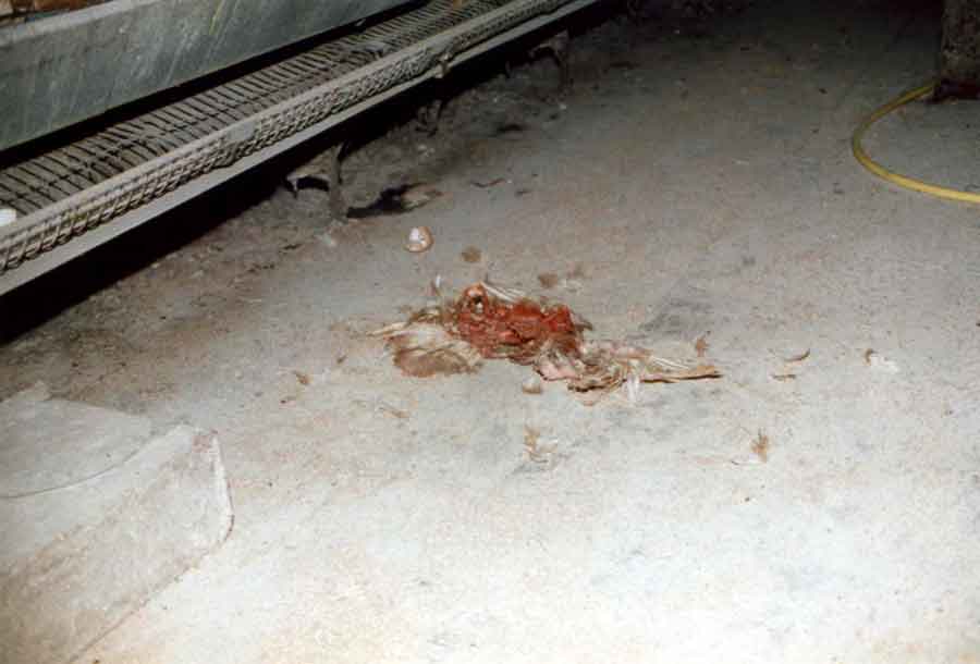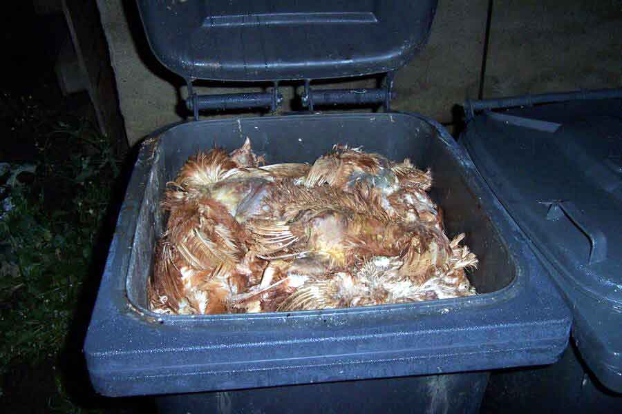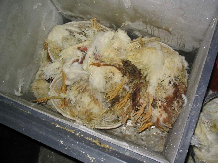 | Überlebt ein Huhn nicht, stehen die anderen im Käfig auf seiner verwesenden Leiche, bis diese nach einigen Tagen herausgenommen wird und mit den anderen toten im Müll landet. | Dieses Huhn starb in der Batterie und endete im Müllcontainer. | Dieses Huhn entkam (vermutlich beim Entfernen einer Leiche) und starb in der Kotgrube. | Oft entkommen (beispielsweise wenn Leichen aus den Käfigen entfernt werden) Hühner, die dann in den Gängen sterben (hier dokumentiert bei einer Aktion im August 2000). Ein Huhn (Bild rechts) wurde bei der Aktion noch lebend neben der Leiche sitzend gefunden, es gelang, es einzufangen und so (mit anderen, die aus den Käfigen befreit wurden) zu retten. | Hier eine von zwei Leichen in den Gängen einer anderen Batterie, Januar 2001. Weitere Bilder in der Rubrik Tierbefreiung, außerdem eine Pressemitteilung zu den verdurstenden Hühnern. | Mülltonnen einer kombinierten Legebatterie- und Mastanlage (deutlich auf einem Bild inmitten der Organe zu erkennen die (ungelegten) Eier (noch ohne Schale und Eiklar). | Nicht nur in Legebatterien, sondern auch in anderen Hennenhaltungen sterben täglich unzählige Tiere. | Eine "Aufzuchtanlage", in der Hennen nach dem Schlüpfen etwa drei Monate verbringen, bis sie beginnen Eier zu legen, näheres siehe Pressemitteilung. Weitere Bilder in der Rubrik Befreiungen. Hier liegt ein totes Huhn auf einem Tisch im Gang zwischen den Käfigreihen. In den linken Bildern deutlich zu sehen die Staubpartikel, die das Tragen von Atemschutz erforderlich machen, sowie rechts einige der zahllosen Insekten. | Außerhalb der Anlage stehen üblicherweise Mülltonnen, in denen die Tiere, die die Bedingungen nicht überleben, enden. Diese waren aufgrund des heißen Sommers jedoch leer, stattdessen war eine Kühltruhe voller Leichen aufgestellt. | Gut einen Monat später war nicht nur die Kühltruhe voll, auch in den Mülltonnen befanden sich wieder Leichen. | Auch durch die Mast sterben Tiere, hier Gänse - viele schon als Kücken. | Etwa eine Woche alte Truthuhnkücken in der Masthalle. Näheres zu der Aktion, bei der diese und die beiden folgenden Bilder (sowie weitere Bilder von der Befreiung) entstanden, in der Presseerklärung. | Ein etwa zwei Monate altes Truthuhnkücken, tot in der Vorhalle der Putenmast. | Forellenleichen. Bilder eines Aquariums in der Kleinmarkthalle in der Rubrik "Fische". | Leichen verschiedener Fische, u.a. ein Seeteufel (engl. Monkfish, frz. Lotte), dem der Kopf eines anderen in den Mund gesteckt wurde, zusammen mit einer Zitrone und Petersilie. | Leichen verschiedener Meeresbewohner, u.a. Oktopusse, Garnelen und Langusten. | Kaninchenleichen. | Tauben, Wachteln und sogenannte "Flugenten". | Jagdopfer: Fasane. | Füße von Kälbern und Lämmern, Köpfe und Mägen von Lämmern. | Gehirne von Schafen. | Passend dazu das Gewürz und eine Plastikfigur eines Lamms. | Leichen, vermutlich von Schafen. | Kopf eines Schweins. | Weitere Bilder von Leichen bei Auslegeaktionen und den Vorbereitungen dazu. | Geköpfte Leiche eines Lamms, Teil eines Hinterbeins eines Kalbs im Karlsruher Schlachthof. | Überreste von Jagdopfern in einer Bodengrube nahe einem Hochsitz, an dem Tiere gekirrt (mit Nahrung angelockt) werden. | Opfer (auch) der Milchtrinker und Käsefresser | In einem Leichentransporter. | Ferkel in einer Mülltonne vor einer "Aufzuchtanlage". | Leichen vor einer "Mastanlage". | ||||||||||||||||||||||||||||||||||