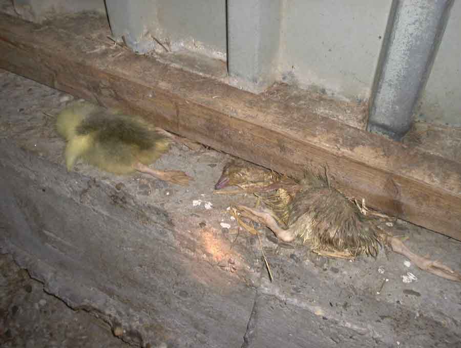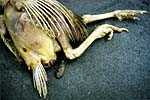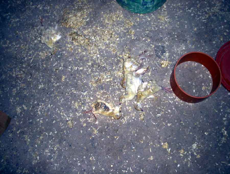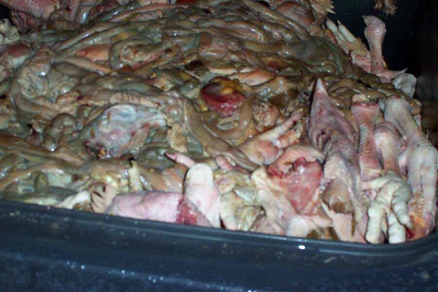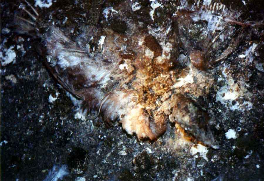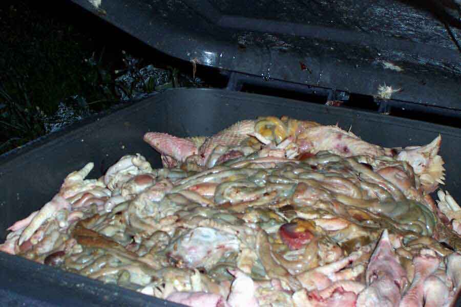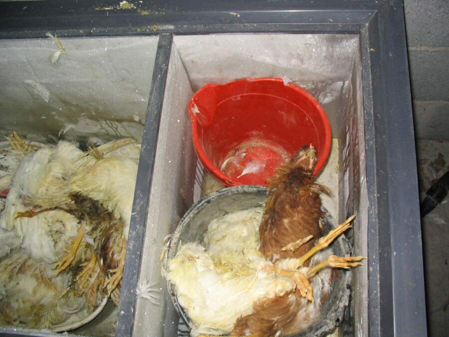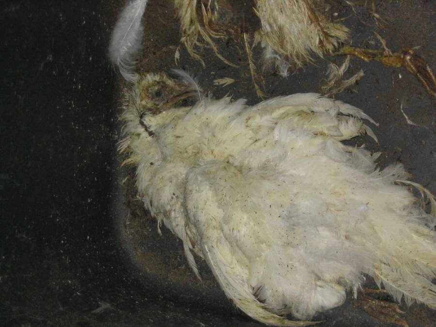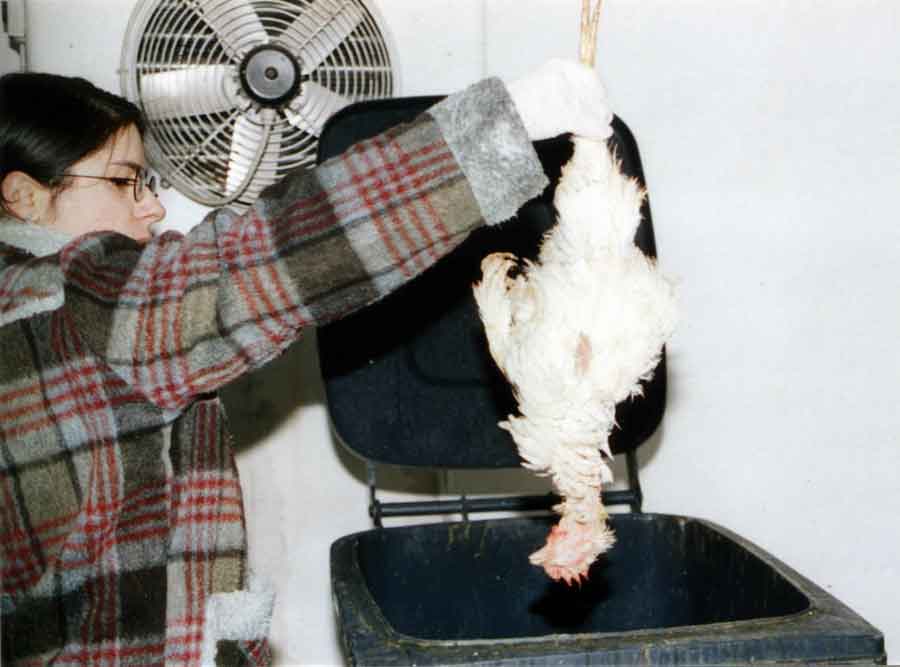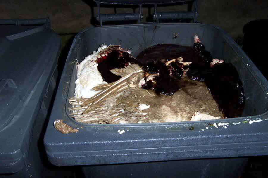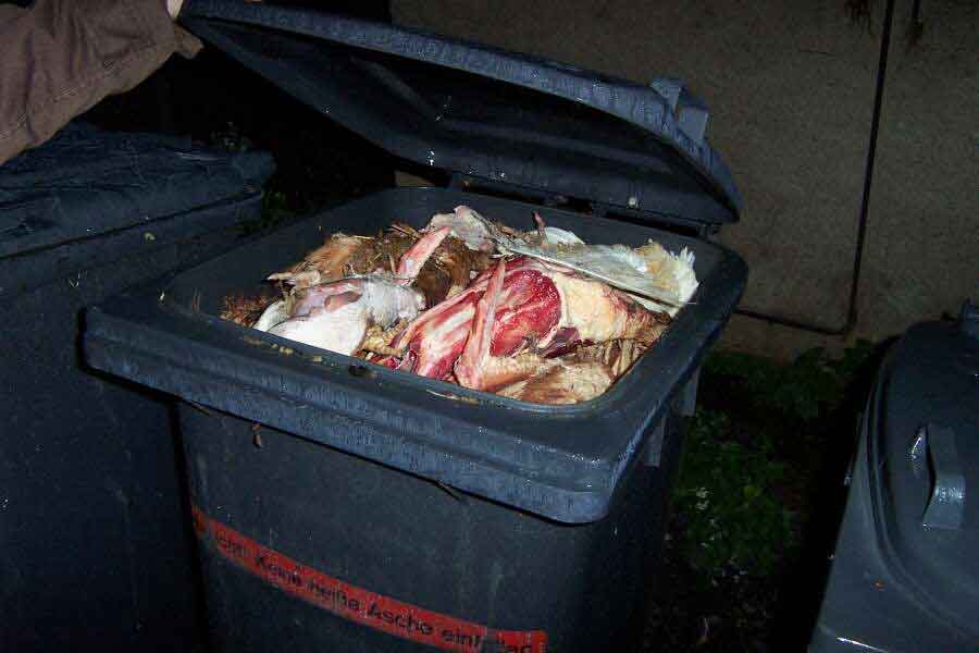 | Überlebt ein Huhn nicht, stehen die anderen im Käfig auf seiner verwesenden Leiche, bis diese nach einigen Tagen herausgenommen wird und mit den anderen toten im Müll landet. | Dieses Huhn starb in der Batterie und endete im Müllcontainer. | Dieses Huhn entkam (vermutlich beim Entfernen einer Leiche) und starb in der Kotgrube. | Oft entkommen (beispielsweise wenn Leichen aus den Käfigen entfernt werden) Hühner, die dann in den Gängen sterben (hier dokumentiert bei einer Aktion im August 2000). Ein Huhn (Bild rechts) wurde bei der Aktion noch lebend neben der Leiche sitzend gefunden, es gelang, es einzufangen und so (mit anderen, die aus den Käfigen befreit wurden) zu retten. | Hier eine von zwei Leichen in den Gängen einer anderen Batterie, Januar 2001. Weitere Bilder in der Rubrik Tierbefreiung, außerdem eine Pressemitteilung zu den verdurstenden Hühnern. | Mülltonnen einer kombinierten Legebatterie- und Mastanlage (deutlich auf einem Bild inmitten der Organe zu erkennen die (ungelegten) Eier (noch ohne Schale und Eiklar). | Nicht nur in Legebatterien, sondern auch in anderen Hennenhaltungen sterben täglich unzählige Tiere. | Eine "Aufzuchtanlage", in der Hennen nach dem Schlüpfen etwa drei Monate verbringen, bis sie beginnen Eier zu legen, näheres siehe Pressemitteilung. Weitere Bilder in der Rubrik Befreiungen. Hier liegt ein totes Huhn auf einem Tisch im Gang zwischen den Käfigreihen. In den linken Bildern deutlich zu sehen die Staubpartikel, die das Tragen von Atemschutz erforderlich machen, sowie rechts einige der zahllosen Insekten. | Außerhalb der Anlage stehen üblicherweise Mülltonnen, in denen die Tiere, die die Bedingungen nicht überleben, enden. Diese waren aufgrund des heißen Sommers jedoch leer, stattdessen war eine Kühltruhe voller Leichen aufgestellt. | Gut einen Monat später war nicht nur die Kühltruhe voll, auch in den Mülltonnen befanden sich wieder Leichen. | Auch durch die Mast sterben Tiere, hier Gänse - viele schon als Kücken. | Etwa eine Woche alte Truthuhnkücken in der Masthalle. Näheres zu der Aktion, bei der diese und die beiden folgenden Bilder (sowie weitere Bilder von der Befreiung) entstanden, in der Presseerklärung. | Ein etwa zwei Monate altes Truthuhnkücken, tot in der Vorhalle der Putenmast. | Forellenleichen. Bilder eines Aquariums in der Kleinmarkthalle in der Rubrik "Fische". | Leichen verschiedener Fische, u.a. ein Seeteufel (engl. Monkfish, frz. Lotte), dem der Kopf eines anderen in den Mund gesteckt wurde, zusammen mit einer Zitrone und Petersilie. | Leichen verschiedener Meeresbewohner, u.a. Oktopusse, Garnelen und Langusten. | Kaninchenleichen. | Tauben, Wachteln und sogenannte "Flugenten". | Jagdopfer: Fasane. | Füße von Kälbern und Lämmern, Köpfe und Mägen von Lämmern. | Gehirne von Schafen. | Passend dazu das Gewürz und eine Plastikfigur eines Lamms. | Leichen, vermutlich von Schafen. | Kopf eines Schweins. | Weitere Bilder von Leichen bei Auslegeaktionen und den Vorbereitungen dazu. | Geköpfte Leiche eines Lamms, Teil eines Hinterbeins eines Kalbs im Karlsruher Schlachthof. | Überreste von Jagdopfern in einer Bodengrube nahe einem Hochsitz, an dem Tiere gekirrt (mit Nahrung angelockt) werden. | Opfer (auch) der Milchtrinker und Käsefresser | In einem Leichentransporter. | Ferkel in einer Mülltonne vor einer "Aufzuchtanlage". | Leichen vor einer "Mastanlage". | ||||||||||||||||||||||||||||||||||