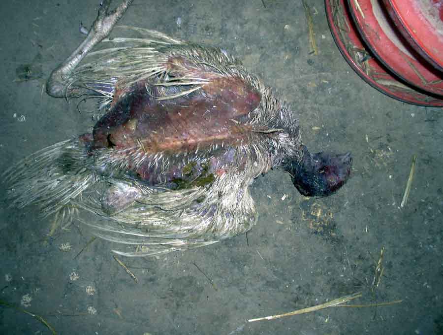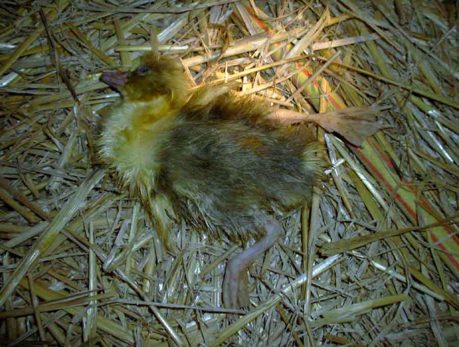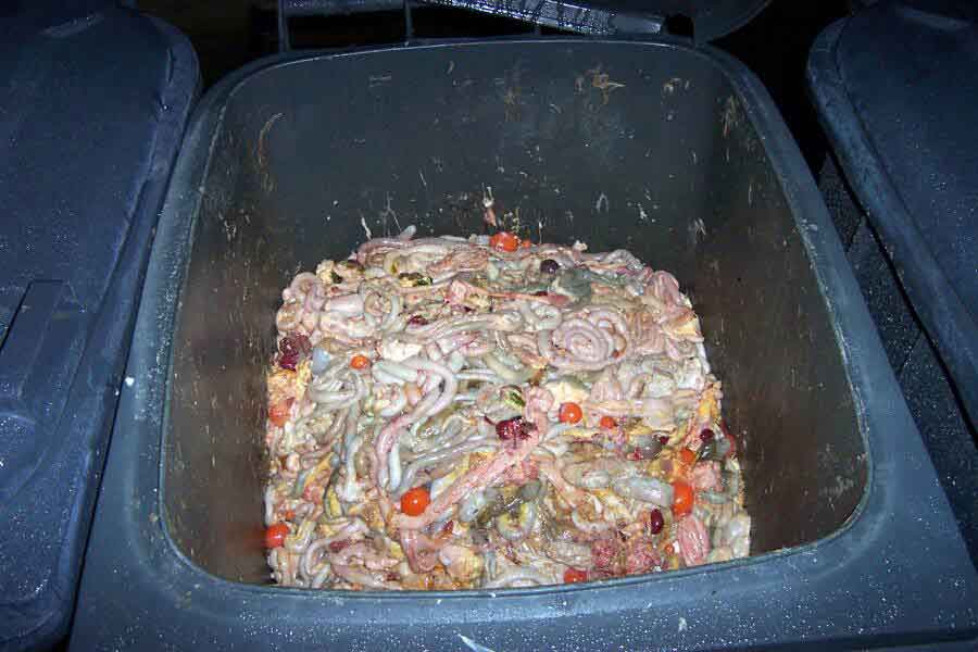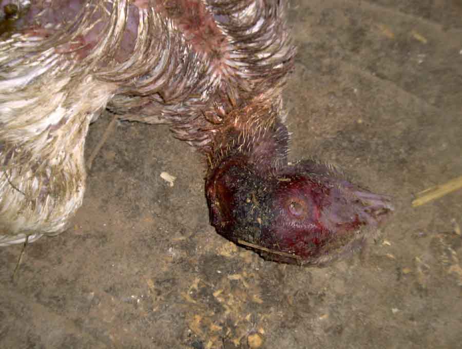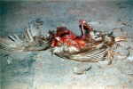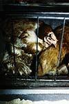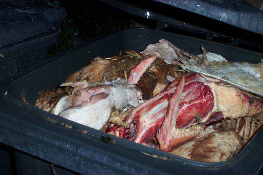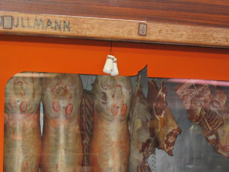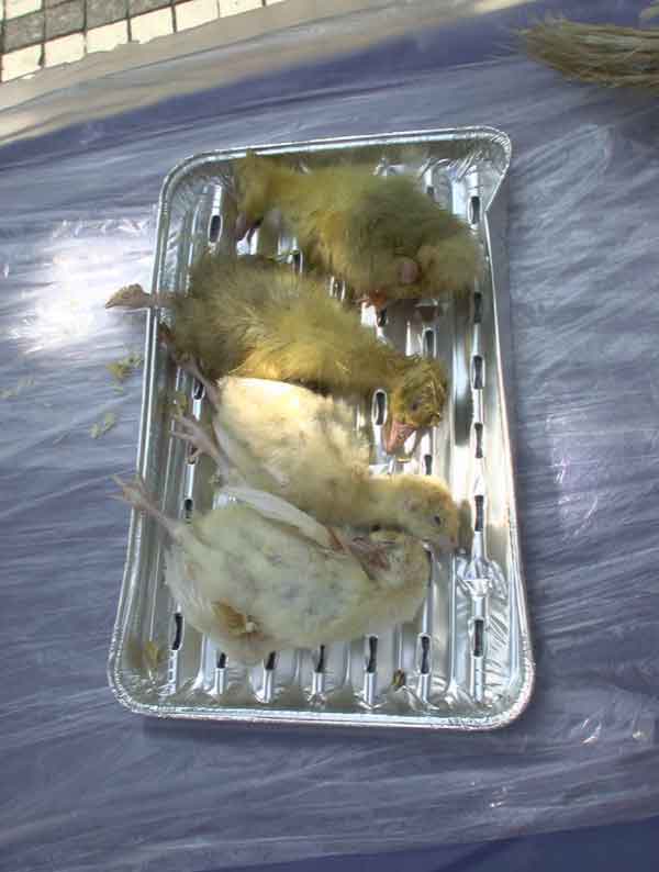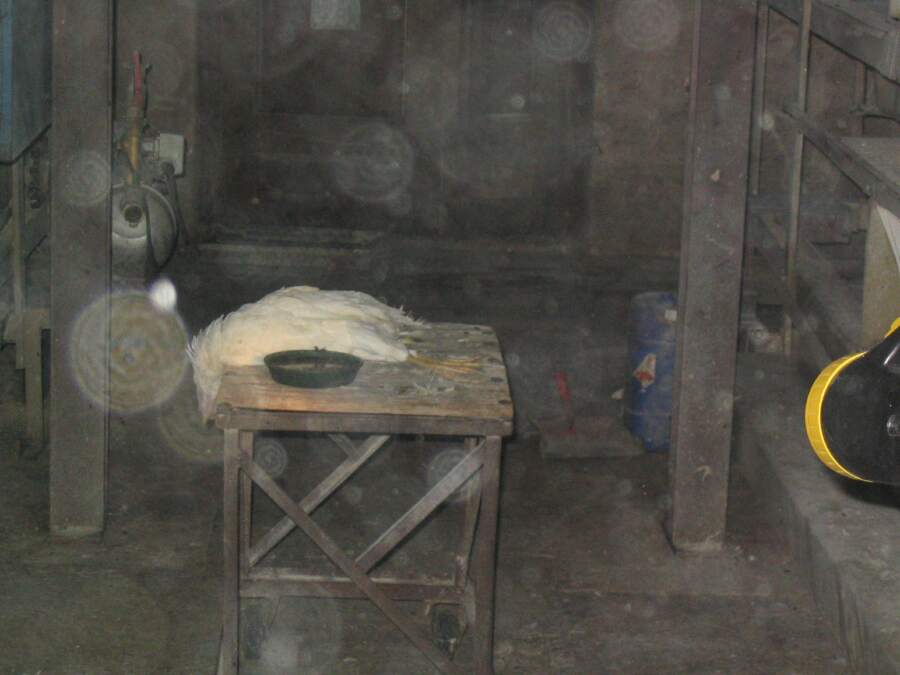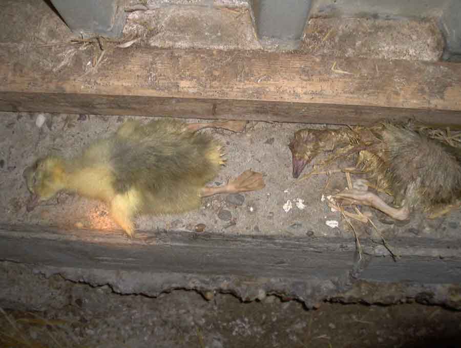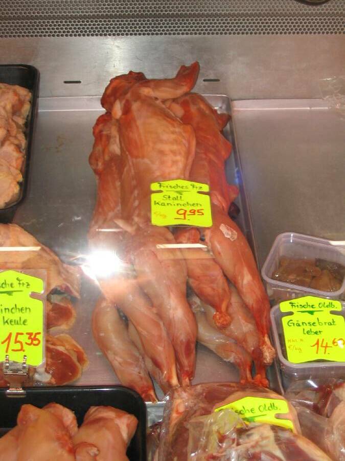 | Überlebt ein Huhn nicht, stehen die anderen im Käfig auf seiner verwesenden Leiche, bis diese nach einigen Tagen herausgenommen wird und mit den anderen toten im Müll landet. | Dieses Huhn starb in der Batterie und endete im Müllcontainer. | Dieses Huhn entkam (vermutlich beim Entfernen einer Leiche) und starb in der Kotgrube. | Oft entkommen (beispielsweise wenn Leichen aus den Käfigen entfernt werden) Hühner, die dann in den Gängen sterben (hier dokumentiert bei einer Aktion im August 2000). Ein Huhn (Bild rechts) wurde bei der Aktion noch lebend neben der Leiche sitzend gefunden, es gelang, es einzufangen und so (mit anderen, die aus den Käfigen befreit wurden) zu retten. | Hier eine von zwei Leichen in den Gängen einer anderen Batterie, Januar 2001. Weitere Bilder in der Rubrik Tierbefreiung, außerdem eine Pressemitteilung zu den verdurstenden Hühnern. | Mülltonnen einer kombinierten Legebatterie- und Mastanlage (deutlich auf einem Bild inmitten der Organe zu erkennen die (ungelegten) Eier (noch ohne Schale und Eiklar). | Nicht nur in Legebatterien, sondern auch in anderen Hennenhaltungen sterben täglich unzählige Tiere. | Eine "Aufzuchtanlage", in der Hennen nach dem Schlüpfen etwa drei Monate verbringen, bis sie beginnen Eier zu legen, näheres siehe Pressemitteilung. Weitere Bilder in der Rubrik Befreiungen. Hier liegt ein totes Huhn auf einem Tisch im Gang zwischen den Käfigreihen. In den linken Bildern deutlich zu sehen die Staubpartikel, die das Tragen von Atemschutz erforderlich machen, sowie rechts einige der zahllosen Insekten. | Außerhalb der Anlage stehen üblicherweise Mülltonnen, in denen die Tiere, die die Bedingungen nicht überleben, enden. Diese waren aufgrund des heißen Sommers jedoch leer, stattdessen war eine Kühltruhe voller Leichen aufgestellt. | Gut einen Monat später war nicht nur die Kühltruhe voll, auch in den Mülltonnen befanden sich wieder Leichen. | Auch durch die Mast sterben Tiere, hier Gänse - viele schon als Kücken. | Etwa eine Woche alte Truthuhnkücken in der Masthalle. Näheres zu der Aktion, bei der diese und die beiden folgenden Bilder (sowie weitere Bilder von der Befreiung) entstanden, in der Presseerklärung. | Ein etwa zwei Monate altes Truthuhnkücken, tot in der Vorhalle der Putenmast. | Forellenleichen. Bilder eines Aquariums in der Kleinmarkthalle in der Rubrik "Fische". | Leichen verschiedener Fische, u.a. ein Seeteufel (engl. Monkfish, frz. Lotte), dem der Kopf eines anderen in den Mund gesteckt wurde, zusammen mit einer Zitrone und Petersilie. | Leichen verschiedener Meeresbewohner, u.a. Oktopusse, Garnelen und Langusten. | Kaninchenleichen. | Tauben, Wachteln und sogenannte "Flugenten". | Jagdopfer: Fasane. | Füße von Kälbern und Lämmern, Köpfe und Mägen von Lämmern. | Gehirne von Schafen. | Passend dazu das Gewürz und eine Plastikfigur eines Lamms. | Leichen, vermutlich von Schafen. | Kopf eines Schweins. | Weitere Bilder von Leichen bei Auslegeaktionen und den Vorbereitungen dazu. | Geköpfte Leiche eines Lamms, Teil eines Hinterbeins eines Kalbs im Karlsruher Schlachthof. | Überreste von Jagdopfern in einer Bodengrube nahe einem Hochsitz, an dem Tiere gekirrt (mit Nahrung angelockt) werden. | Opfer (auch) der Milchtrinker und Käsefresser | In einem Leichentransporter. | Ferkel in einer Mülltonne vor einer "Aufzuchtanlage". | Leichen vor einer "Mastanlage". | ||||||||||||||||||||||||||||||||||