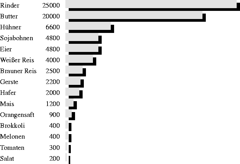 Um ein Kilogramm Rindfleisch zu erzeugen, werden 20-25000 Liter Wasser verbraucht. Mehr als die Hälfte des Wasserverbrauchs in den USA geht auf die Tiermast zurück. Folgende Tabelle zeigt den Wasserbedarf in Litern zur Produktion eines Kilogramms Fleisch, Butter, Eier oder pflanzlicher Lebensmittel (siehe Abb. 3).